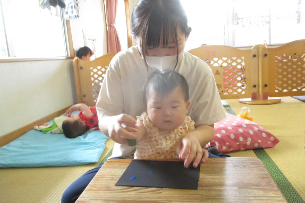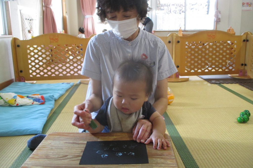 2021年08月05日 スタンプ楽しいね 0歳児 はな オクラスタンプをしました。 保育者と一緒にオクラを手に持ち、画用紙にスタンプをするこどもたち。 オクラの模様をじーっと見つめていました。 黒い画用紙の上にオクラ模様の花火が浮かび上がり、季節のものを使った製作を楽しみました。 一覧へ戻る