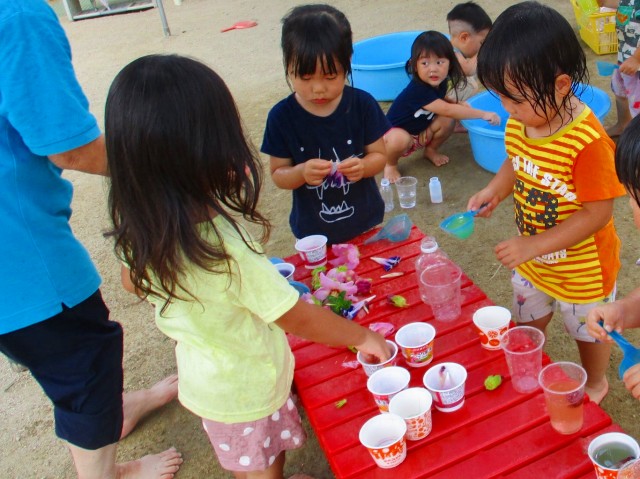 2021年08月10日 ジュースどうぞ 2歳児 にじ 花と絵の具で色水遊びをしました。 色を混ぜたり、花をもんで色水を作ったりしていたこどもたち。 出来た物をジュースに見立ててカップに入れて「ジュースどうぞ」と渡していました。 一覧へ戻る
