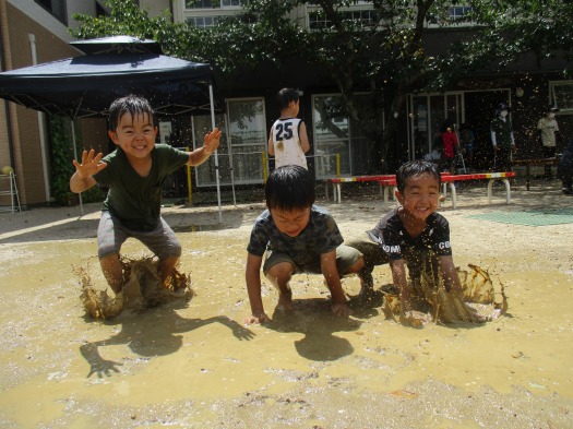 2021年08月10日 水たまりの中で 5歳児 そら 園庭にスプリンクラーを出してどろんこあそびをしました。 しばらく遊んでいると大きな水たまりができ、 そこで泥団子を作ったり、寝転んだりして遊んでいるこどもたち。 今日はその水たまりの中で、リズムをしている子がいました。 カエルになって、ピョ~ン どんぐり どんぐり こ~ろころ 全身ドロドロになりながら、ダイナミックに遊ぶ子どもたちです♪ 一覧へ戻る