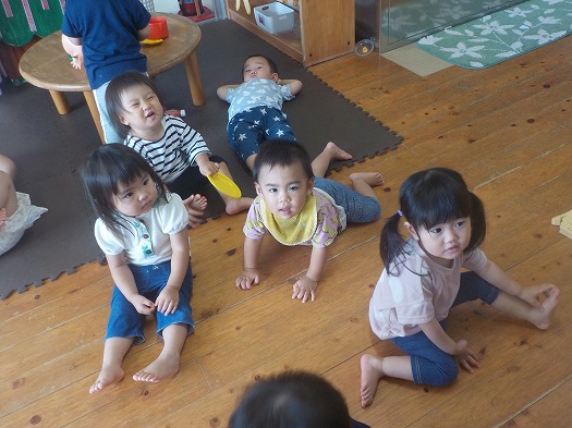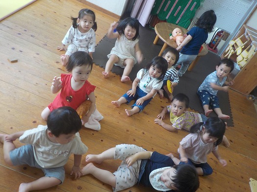 2021年08月17日 ゴーゴー 1歳児 ゆき ”バスに乗って”の曲が流れると、いつもは、保育者の膝に座って楽しんでいますが、 今回は保育者が座っていませんでした。 それがきっかけで、自分たちが床に座りバス役になっていました。 それを見たともだちも、真似をして座りバスに。 あっという間に、みんなバスになって楽しんでいました。 ともだちの動きを真似して模倣できる姿に、成長を感じました。 一覧へ戻る