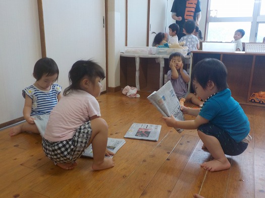 2021年08月20日 新聞紙 1歳児 ゆき 新聞紙を何もすることなく、床にそっと置いてみました。 記事を読んでいるかのように、じっくり見たり、手に持ってみたりして いました。そのまま遊びは続かずだったので、保育者が新聞紙を丸めて 1つ投げました。 それに気が付いた子が「あった」と大喜び。 すぐさま、保育者の真似をして、新聞紙を丸めてボールに。 雪合戦のように、投げ合って楽しみました。 ※写真はブレていますが、それだけ勢いがすごかったこどもたちです(笑) 一覧へ戻る