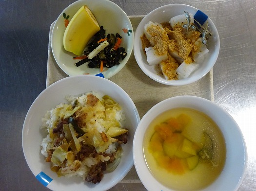 2021年08月24日 給食室(8月19日の給食、おやつ) 給食室 昼食 ・焼肉丼 ・いかときゅうりの和え物 ・夏野菜スープ ・バナナ おやつ ・黒糖きな粉わらび餅 ・煮干し 『焼肉丼』には、牛肉・豚肉・キャベツ・玉ねぎ・もやし・ピーマンが 入っており、食べごたえたっぷりです。 『夏野菜スープ』には冬瓜・ズッキーニ・トマト・オクラが入っています。 トマトの酸味が効いていて、さっぱりいただけました。 おやつは夏らしい、『黒糖きな粉わらび餅』でした。 一覧へ戻る