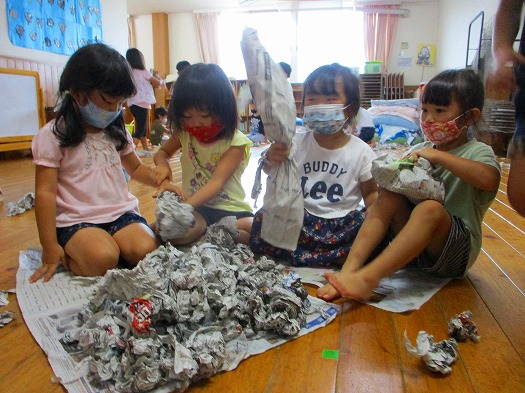 2021年08月23日 新聞を使って 4歳児 ほし 「今日は新聞あそびをするよ」だけ伝えて 部屋の真ん中に新聞紙の束を置いてみました。 するとすぐに新聞紙を広げて細かくちぎったり、 丸めたりして遊び始めたこどもたち。 団子屋さんが開店しています。 丸めた新聞紙をたくさん並べて団子屋さんになったり、 剣を作って戦いごっこが始まったりと 同じ新聞紙を使っていても遊び方はそれぞれです。 その後も、新聞紙でカブトや紙飛行機を作ったり、 ちぎった新聞紙を集めてたき火をしたりとこどもたちならではの 発想で1時間程夢中になって遊んでいました。 一覧へ戻る