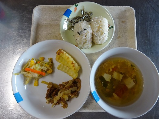 2021年08月25日 給食室(8月24日の給食、おやつ) 給食室 昼食 ・食パン ・ポークマリネード焼き ・焼ポテト ・コーンサラダ ・かき玉トマトスープ おやつ ・梅ちりおにぎり ・煮干し 『ポークマリネード焼き』には、豚肉の他に、 たまねぎ・セロリが入っています。 セロリの独特な風味と酢味の効いたさっぱりとした味つけでしたが、 こどもたちもよくおかわりしていました。 『コーンサラダ』は手作りごまドレッシングで味つけしました。 一覧へ戻る