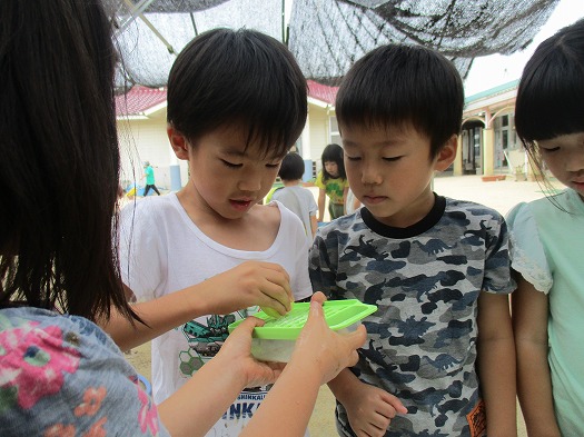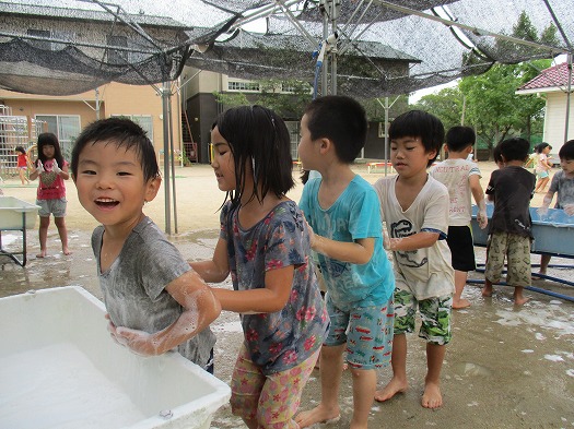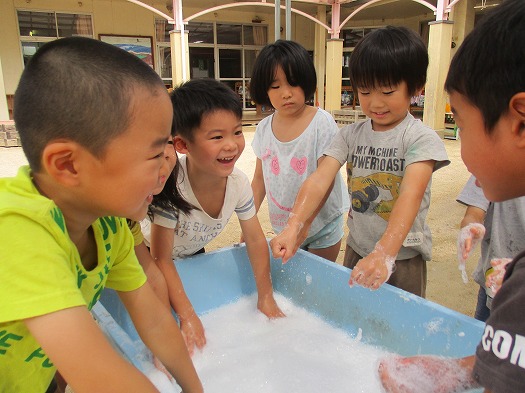 2021年08月25日 泡っておもしろい 5歳児 そら 泡あそびをしました。 まずおろし器で石鹸をグループごとに削りました。 友だちが削る時に、ふたがずれないように押さえてあげるなど、協力する姿に感心しました。 削り終わると勢いよく水を入れてみんなで泡立て開始! 泡を手に取りシャボン玉を作ったり、友だちと泡を塗り合ったり… みんなで力を合わせて泡立てよう 1列に並んで背中に泡を塗ってお風呂ごっこをしている姿もあり、いろいろな遊び方で泡の感触を味わっていました。 背中をゴシゴシ♪きれいになったかな? 一覧へ戻る
