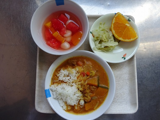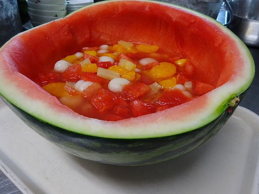 おやつの『すいかポンチ』はすいかの皮を器にして、各クラス配膳しました。
