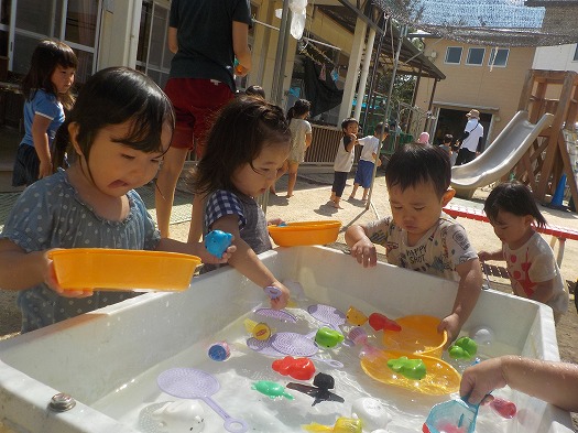 2021年09月02日 金魚すくい 1歳児 ゆき 金魚のおもちゃを水に浮かべると、保育者がポイを使ってすくい取る姿に釘付け。 その後、真似をして、ポイを使って金魚のおもちゃを追いかけるものの、 なかなか難しく、最終的に、金魚のおもちゃを入れる入れ物を使って すくい取っていました。 難しいと感じたら、他のものを使って取ろうとする姿がステキだね。 一覧へ戻る