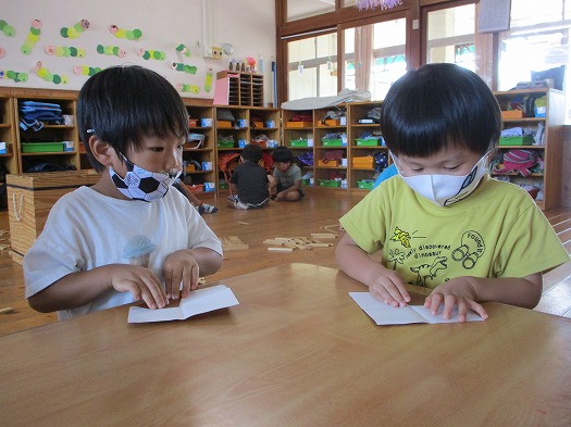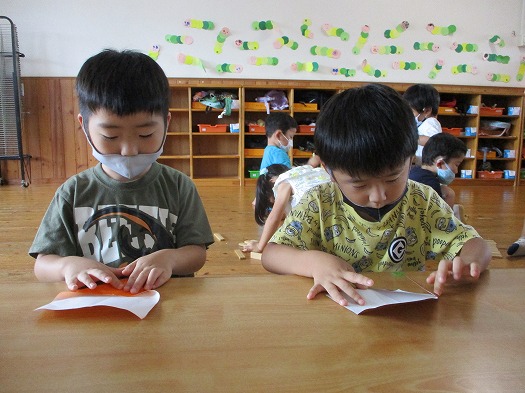 2021年09月08日 どんぐりころころ~♪ 4歳児 ほし 茶色とオレンジの折り紙を使ってどんぐりを作りました。 今までは三角から折り始めるものを作ってきましたが 今回のどんぐりは最初が折り紙を長方形の形になるように 半分に折って、もう1回折って正方形になるように折るものでした。 いつもとは違う折り方でも保育者の見本を見ながら 上手に折っていたこどもたちです。 完成したどんぐりはホールの壁に飾ってあるので ぜひ月曜日に布団をつける時に見てみて下さいね。 一覧へ戻る