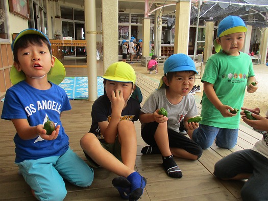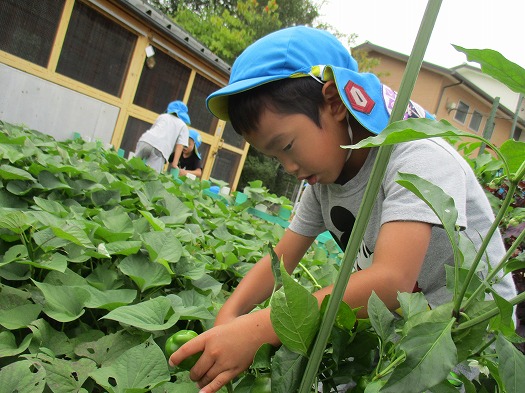 収穫したピーマンをテラスに持って行き匂いを嗅いでいたこどもたち。