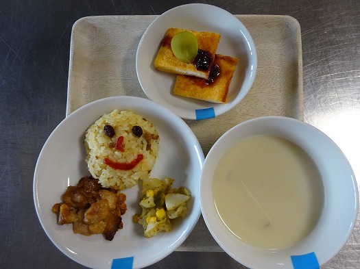 『お月様ピラフ』の目はレーズンで、鼻と口はケチャップで作りました。