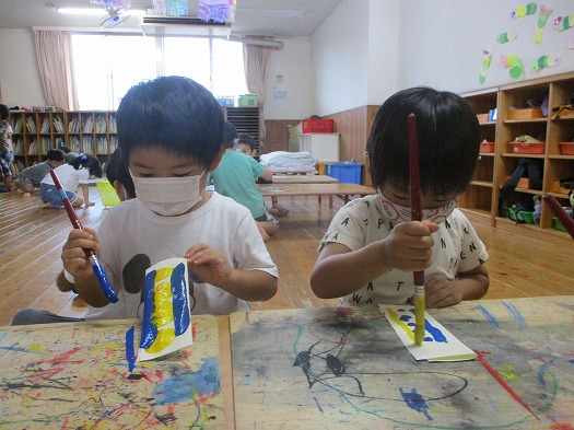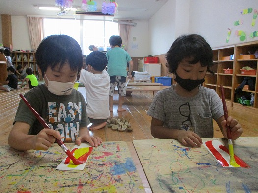 2021年09月18日 何色にしようかな? 4歳児 ほし 運動会の時に会場に飾る装飾を作りました。 春にこいのぼりの製作をした時にも取り入れた デカルコマニーで模様をつけました。 赤、黄、青の3色の絵の具の中から好きな色を2色選んで 点や丸、線など思い思いの模様を描いていくこどもたち。 中には、夢中になりすぎて紙からはみ出るぐらい ダイナミックに描いている子もいました。 どんな装飾ができあがるのか、お楽しみに☆ 一覧へ戻る