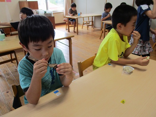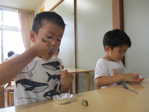 2021年09月28日 秋の味覚 5歳児 そら ある日のおやつに栗が出てきました。 「どうやって食べるん?」と不思議そうなこどもたち。 食べ方を説明すると、スプーンを使って食べ始めます。 とても美味しかったようで「おかわりある?」「もっと食べたい」と大好評! 夢中で食べていました。 「マックスバリューにもあるかなぁ?」と、まだまだ食べ足りない様子で、栗の美味しさに目覚めたこどもたちでした。 一覧へ戻る