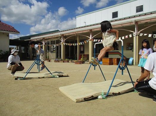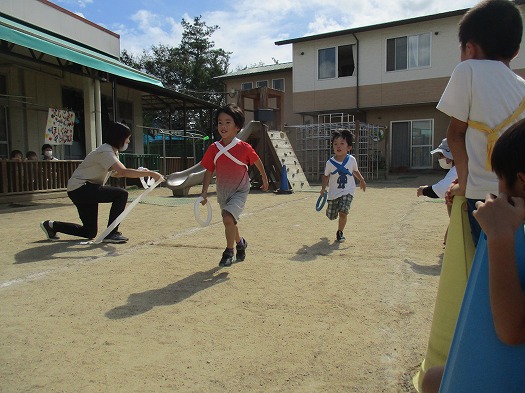2021年09月30日 運動会予行 5歳児 そら 運動会の予行がありました。 こどもたちは朝からドキドキしている様子でしたが、始まるといつもの笑顔で楽しみながらできていました。 元気に行進! 鉄棒で得意な技を披露したよ みんなで力を合わせて引っ張れ~! リレーでは全力で走り抜きました 本番まであと少し。 「あと何日かな?」と楽しみにしているこどもたちです。 一覧へ戻る