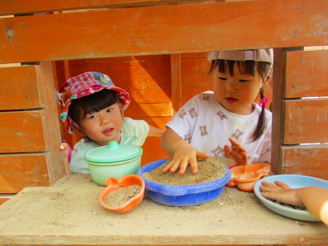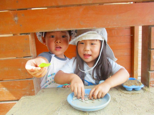 2021年10月05日 お店屋さん 2歳児 にじ 砂場近くの家に入って友だちとお店屋さんごっこ。 「いらっしゃいませ」と言ったり、葉っぱや石をお金に見た立てて「お金です」と言って保育者に渡したりしていました。 友だちや保育者との言葉のやりとりをしながら楽しみました。 一覧へ戻る