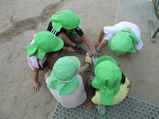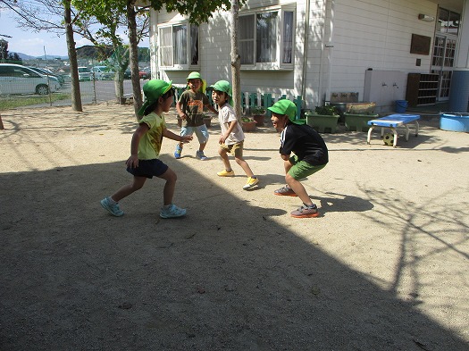2021年10月08日 友だちと一緒に 4歳児 ほし 自由あそびの時間のこと。 友だちを誘い合って鬼ごっこをしていたこどもたち。 鬼決め 鬼決め… 園庭を元気いっぱい走り回り楽しんでいました。 保育者がいなくても自分たちで誘い合ってルールのある あそびができるようになっていて成長を感じました。 一覧へ戻る