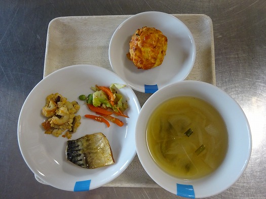 2021年10月18日 給食室(10月13日の給食、おやつ) 給食室 昼食 ・ごはん ・鯖の塩焼き ・炒り豆腐 ・キャベツのごま和え ・にらのみそ汁 おやつ ・かぼちゃのポンデケージョ ・牛乳 『炒り豆腐』には、豆腐、鶏ひき肉、ちくわ、ごぼう、干ししいたけ、 グリンピース、卵が入っています。 各食材のうまみが感じられる一品でした。 箸でつまむのに苦戦しながらも、がんばって食べていました。 『かぼちゃのポンデケージョ』は新メニューです。 旬の食材のかぼちゃの甘みと、チーズの塩味がぴったりでした。 一覧へ戻る