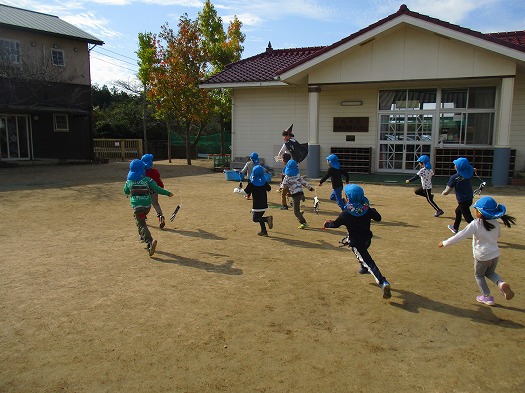 お菓子を持っている保育者を見つけると、「トリックオアトリート!」と言いながら追いかけるそら組でした。