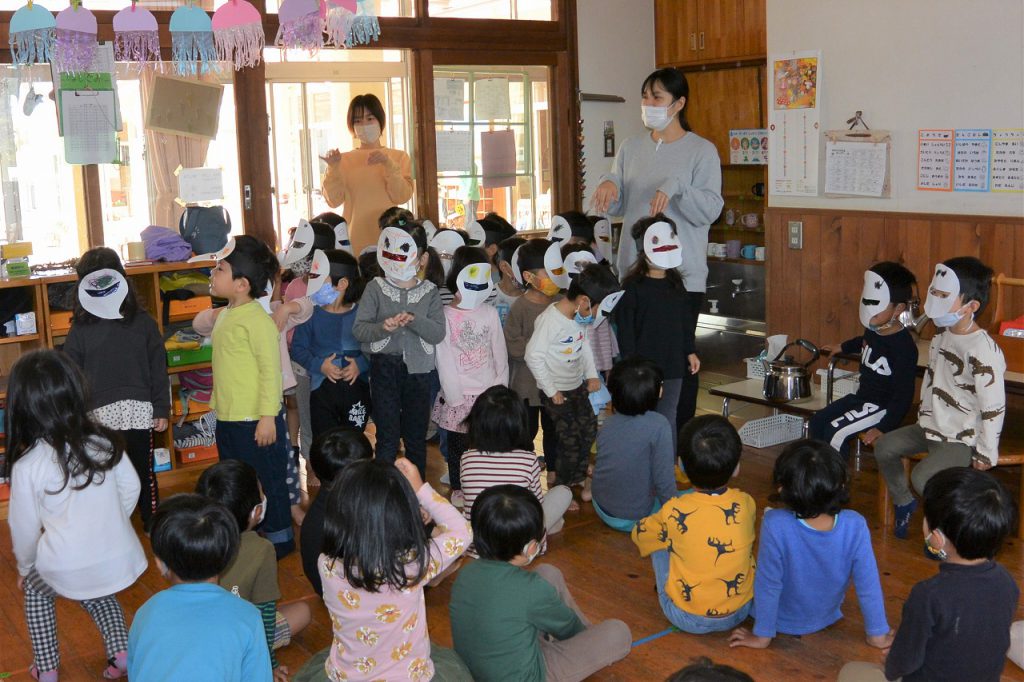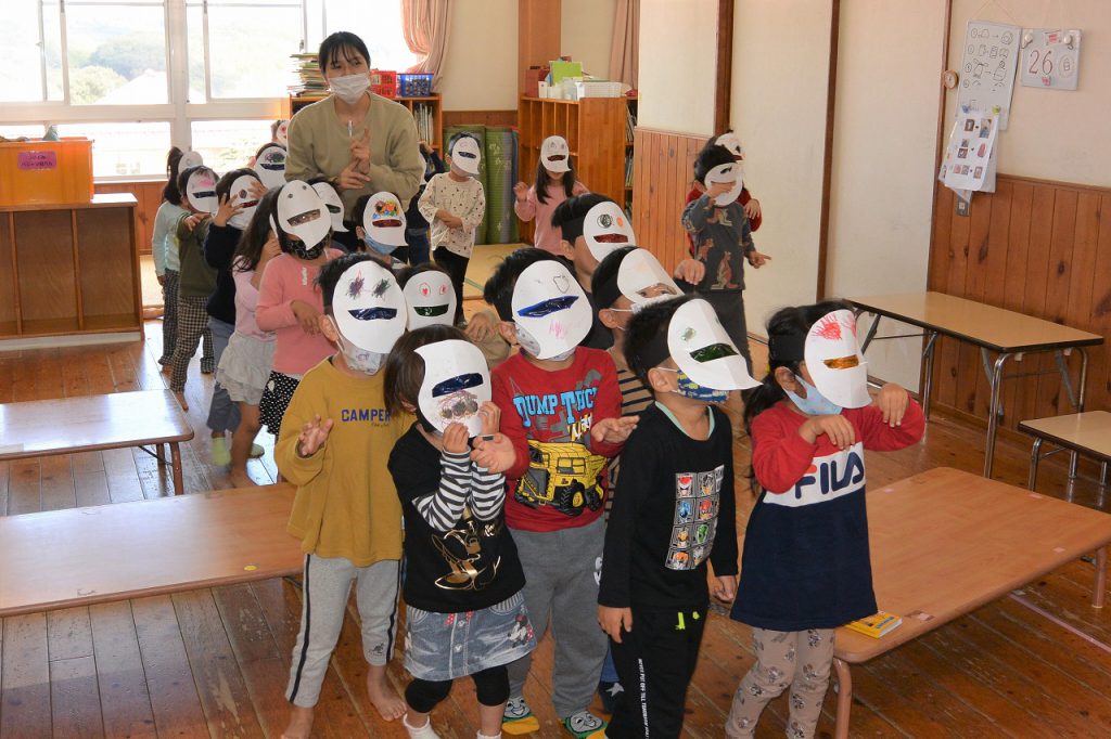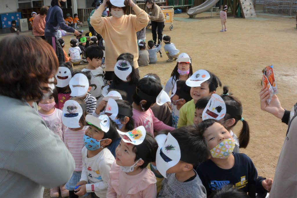 2021年11月01日 ハロウィン 3歳児 つき お化けになって他クラスの友だちを驚かせよう! 手作りのお面をかぶって、いろいろなクラスを訪問しました。 最後は園庭でグミをもらって、ご満悦のこどもたちでした。 一覧へ戻る
