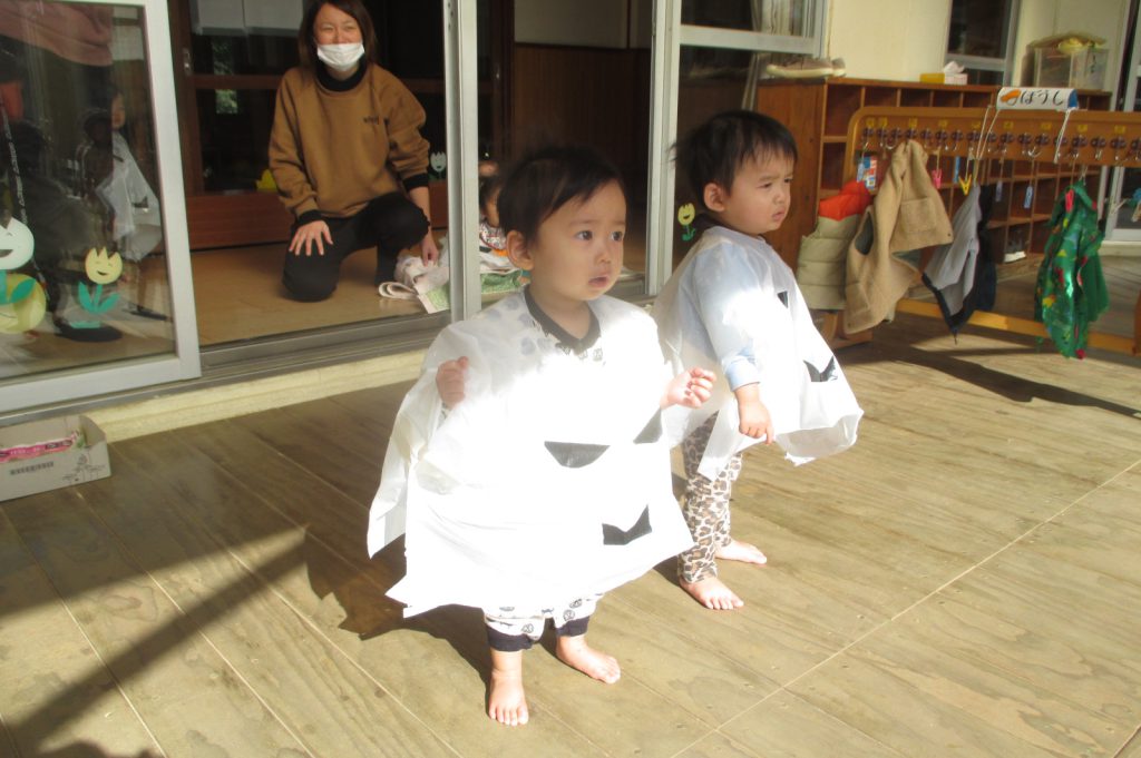 2021年11月01日 おばけだぞー 0歳児 はな ビニールで作ったおばけの服を着て他のクラスを回りました。 他のクラスの友だちや保育者に「かわいいね」と声をかけられ、嬉しかったのか自分で歩き、どんどん廊下を進んでいくこどもたちです。 たくさんの友達に声をかけられ、大人気なはな組のおばけさんたちでした。 一覧へ戻る