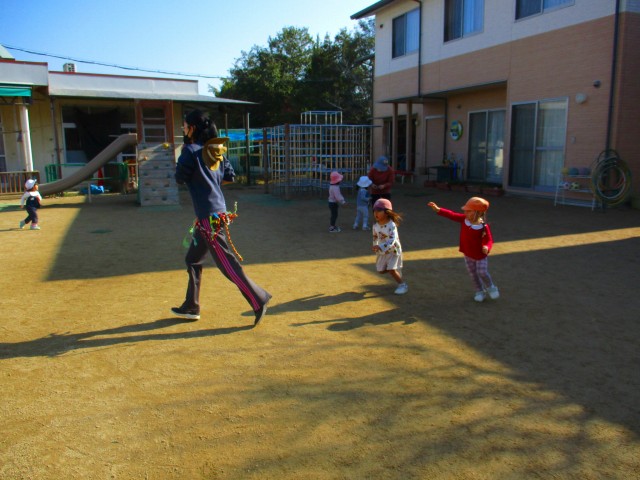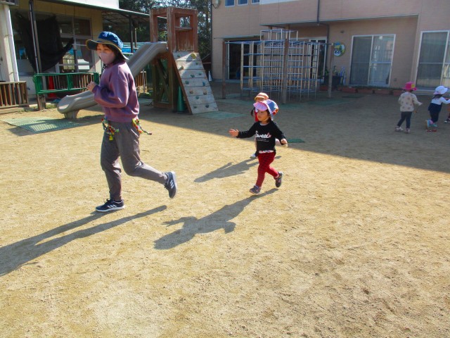 保育者がしっぽをつけて走るとおもいっきり走って追いかけるこどもたち。