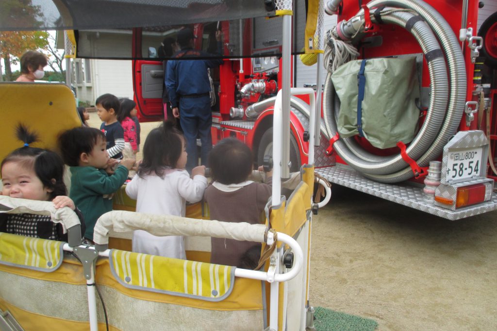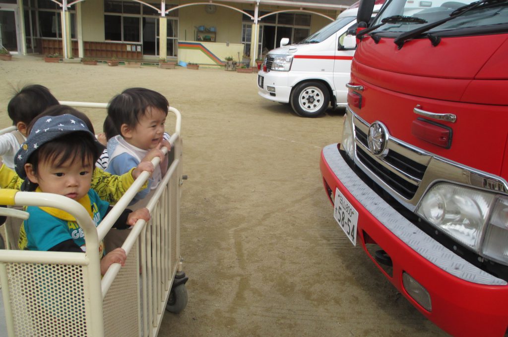 2021年11月11日 何の車だろう? 0歳児 はな 園庭に消防車と救急車がやってきたので、散歩車に乗って近くへ行ってみました。 あまり近くで見ることのない大きな車に興味津々で、「あ!あ!」と指をさしたりじーっと見たりしていました。 保育室に帰っても気になり窓の方へ見に行くこどもたちでした。 一覧へ戻る