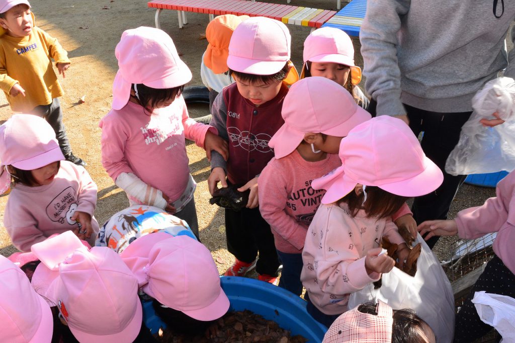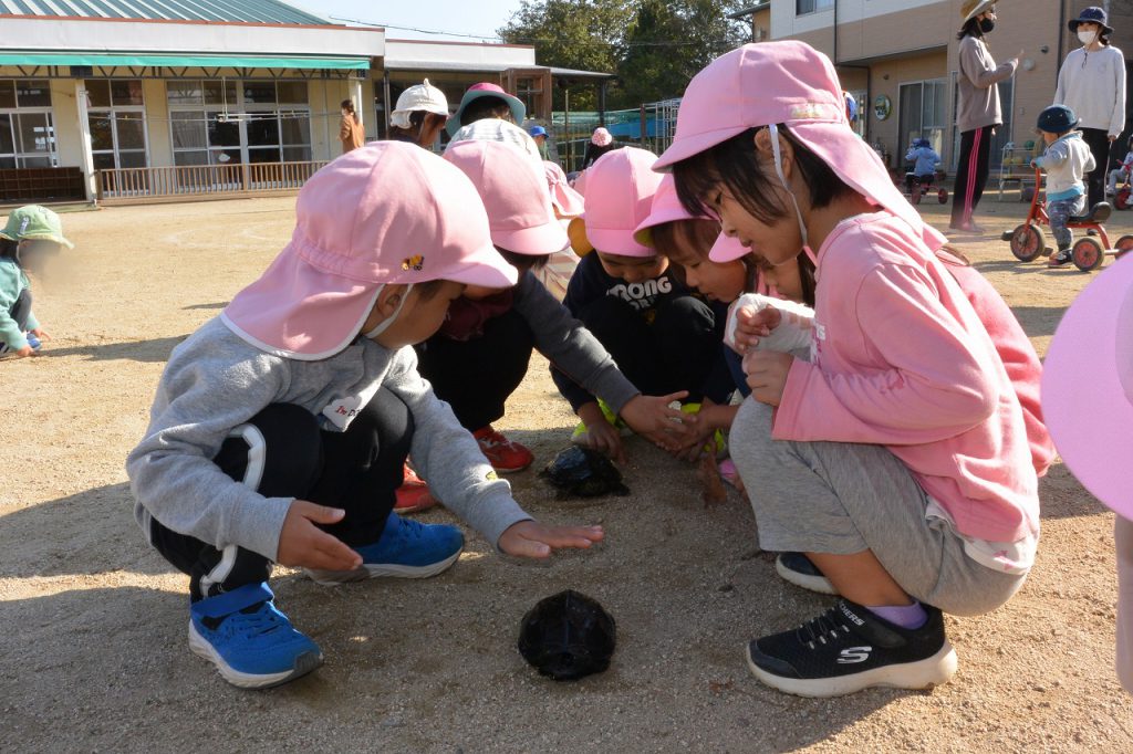 2021年11月16日 落ち葉の布団 3歳児 つき 園庭で飼っているカメの越冬に備えて いっぱいの落ち葉でお布団を作ってあげました。 冬眠前、最後のお散歩を見送って… 落ち葉のお布団の中に入れてあげました。 みんなが進級する頃に再会しようね! 一覧へ戻る