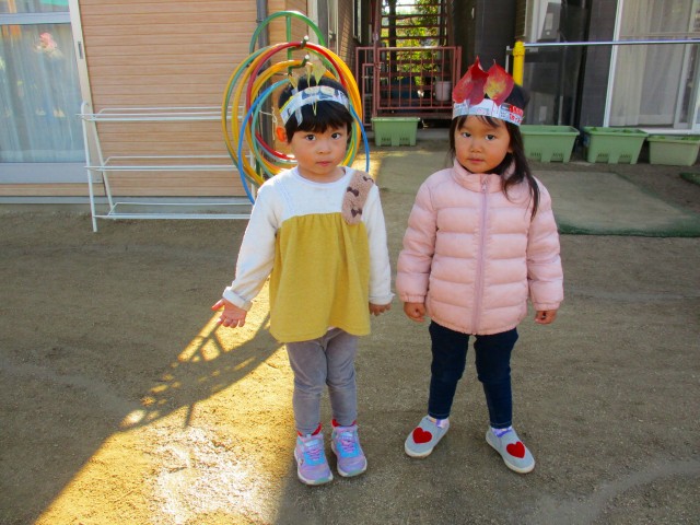 落ち葉を使って、かんむりやベルトやステッキを作りました。