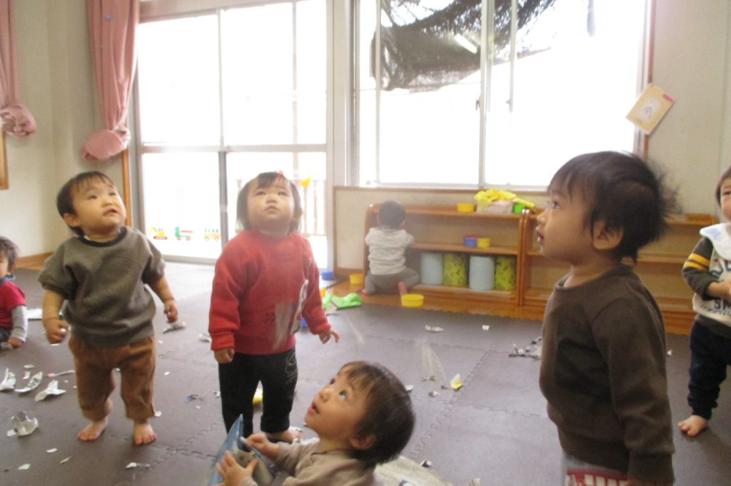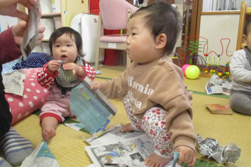 新聞あそびをしました。保育者が新聞をびりびりとちぎると、こどもたちも新聞を持ったりちぎろうとしたりしていました。