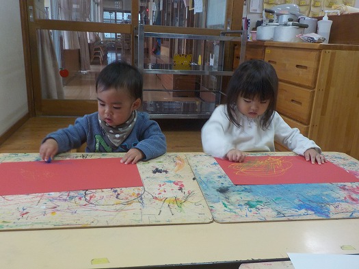 2021年11月24日 クレヨンで 1歳児 ゆき クリスマスに向けて、少し早いですが製作をしました。 今回は、画用紙に、クレヨンでなぐり描きをしました。 自分で、クレヨンの色を選び、 点や横の曲線、縦の曲線、丸なども見られ、いろいろな描き方を するこどもたちに、成長を感じました。 一覧へ戻る