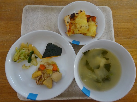 2021年12月04日 給食室(12月3日の給食、おやつ) 給食室 昼食 ・雑穀ごはん ・八宝菜 ・かぼちゃの甘煮 ・大根サラダ ・豆腐のみそ汁 おやつ ・ピザトースト ・牛乳 『切干サラダ』から『大根サラダ』に変更しています。 とよた保育園からいただいた大根を使用しました。 みずみずしい大根でとても甘く、旬の味を楽しみました。 みそ汁には大根についていた大根葉を入れました。 一覧へ戻る