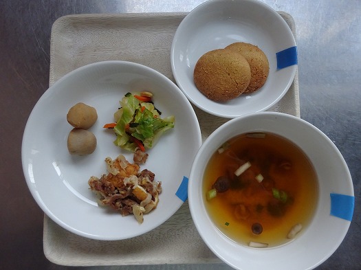 2021年12月08日 給食室(12月6日の給食、おやつ) 給食室 昼食 ・ごはん ・豚肉と厚揚げのオイスターソース炒め ・里芋の煮っころがし ・チンゲン菜のピーナッツ和え ・なめこの赤だし おやつ ・スキムミルククッキー 『豚肉と厚揚げのオイスターソース炒め』は、 オイスターソース、ごま油、かつお節粉で味つけしています。 『なめこの赤だし』には、とよた保育園からいただいた大根を入れました。 おたのしみおやつは『スキムミルククッキー』です。 バターのかわりにサラダ油を使用しているので、 ちんすこうに似た食感になりました。 一覧へ戻る