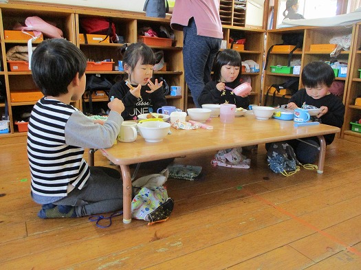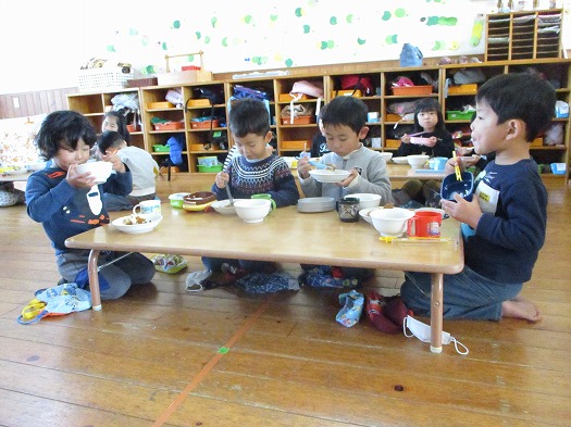 2021年12月06日 こんなこともできるよ 4歳児 ほし いつもはホールで椅子に座って食べているお昼ご飯。 先日、久しぶりにほし組の部屋で座机を使って食べてみました。 姿勢が崩れることなく食べる姿に成長を感じました。 ほし組での生活がスタートして8ヶ月。 いろいろなことができるようになっています。 一覧へ戻る