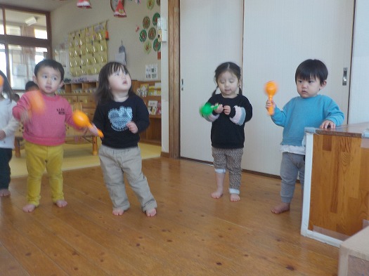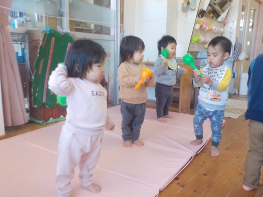 2021年12月07日 マラカス使って 1歳児 ゆき クリスマスの曲をバックに、カエルのマラカスを振りました。 曲がかかると、すぐに上下や左右に振って音を鳴らしています。 これからも、いろいろな楽器や音色を聞いて、楽しんでいきます。 一覧へ戻る