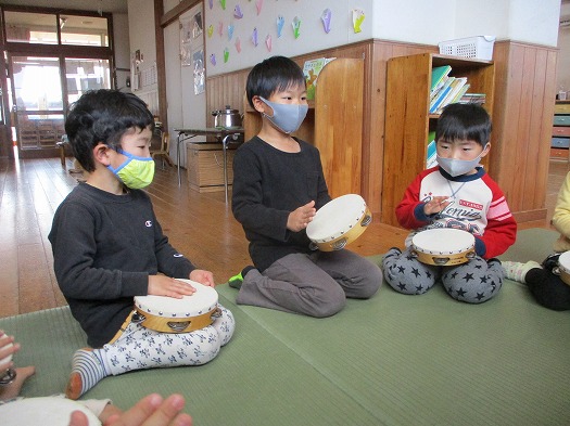 2021年12月22日 自分たちで 4歳児 ほし 発表会に向けて楽器あそびを楽しんでいます。 タンバリン、カスタネット、すずの中から自分で好きな楽器を選びました。 みんなでリズム打ちをした後、それぞれの楽器に分かれて練習をしました。 “どうするのかな?”と思いこどもたちの様子を見ていると 1人の子が まるで保育者のように 「いくよ、せーの」と みんなに声をかけて練習を進めていました。 保育者がいなくても、自分たちでやってみようとする気持ちや姿に成長を感じました。 一覧へ戻る