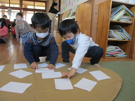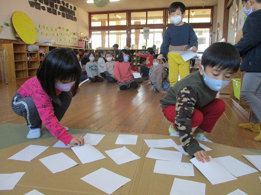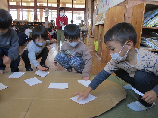 2021年12月22日 何ができるかな? 4歳児 ほし 切ったダンボールに白い紙を貼って劇あそびで使う大道具作りをしました。 紙の裏には両面テープがついているので、まずは剥離紙をはがします。 両面テープは今まで製作の中でも使ったことがあるので 器用に指先を使って上手にはがしていました。 ダンボールのあいている部分を探してどんどん貼っていき、 大きな〇〇〇が完成しました。 発表会の劇あそびの中に出てくるので、 何ができあがったのか 楽しみにしておいてくださいね。 一覧へ戻る