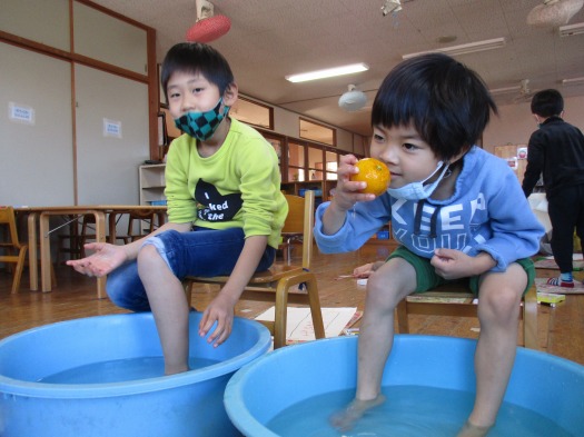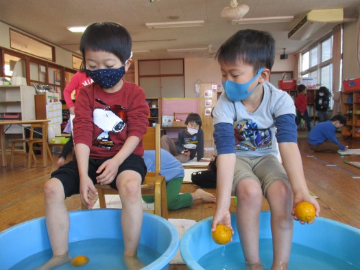 2021年12月27日 ゆったりした時間 5歳児 そら ゆずの足湯をしました。 「あったか~い」「いい匂い」とゆずの香りを楽しみながら、 ゆったり、のんびりした時間を楽しむことができました。 心も体も温まったね。 一覧へ戻る
