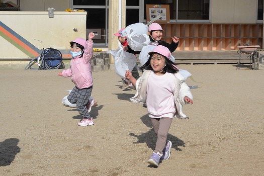 糸を持つ手に感じる抵抗感が心地よくて、園庭をかけ回るこどもたちです。