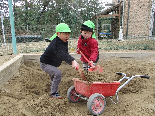 2022年01月18日 ここを掘ったら… 4歳児 ほし 砂場で大きなスコップを持ってせっせと穴を掘っていた2人。 「何をしているの?」と聞いてみると「温泉を掘ってる」とのこと。 こどもは風の子で、寒くても元気に遊んでいますが 砂場に温泉があるときっと保育園の人気スポットになりそうですね。 こどもたちの想像力は豊かで、いつも感心してしまいます。 一覧へ戻る