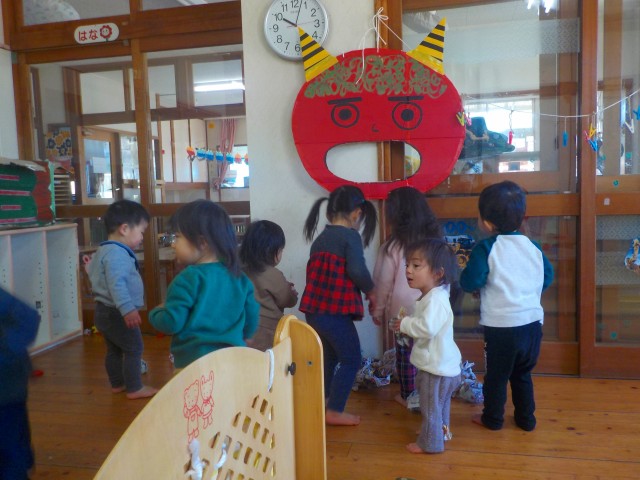 2022年02月05日 えいっ 1歳児 ゆき 新聞紙を丸め豆に見立てた、紙豆を準備し、 大きな顔のダンボール鬼を退治しました。 動かすと、ちょっぴり怖いようですが、 壁に吊るすと、嬉しそうに紙豆を投げていました。 鬼の口に、ポトンと落とす子もいて、遊び方はいろいろでした。 一覧へ戻る