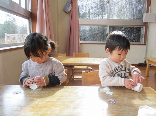 2022年02月17日 のりでペタッ 1歳児 ゆき 和柄の折り紙をペタッと貼っていきます。 貼り付けるものが、紙コップで、不安定な状態でしたが、 片手でコップを固定して、器用に貼り付けていたので、 いろいろ考えてるんだなと感じました。 一覧へ戻る