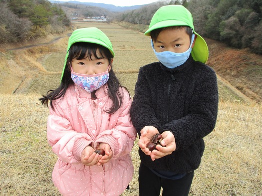 2022年02月19日 裏山に出発! 4歳児 ほし 裏山まで散歩に出かけました。 「つき組の時に来たことある」「あっちに魚がおるよ」など 会話も弾み、どんどん進んで行くこどもたち。 どんぐりや栗などが落ちているのを見つけると拾って 嬉しそうに友だちや保育者に見せていました。 池にいる鳥を眺めたり、端から端まで走ったりして 1時間程のんびりと過ごし、久しぶりの散歩を楽しみました。 一覧へ戻る