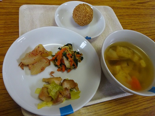 2022年02月21日 給食室(2月21日の給食、おやつ) 給食室 昼食 ・ごはん ・鶏ちゃん ・あみ大根 ・野菜のねばねば和え ・かみなり汁 おやつ ・ごまだんご ・牛乳 『野菜のねばねば和え』には納豆、にんじん、小松菜と白菜が入っています。 白菜は旬なので甘さがあり、いつもより食べやすかったです。 おたのしみおやつは『ごまだんご』でした。 生地は白玉粉と蒸しパンミックス、中にはこしあんが入っています。 シンプルなおやつですが、もっちりと食べごたえのあるおやつでした。 一覧へ戻る