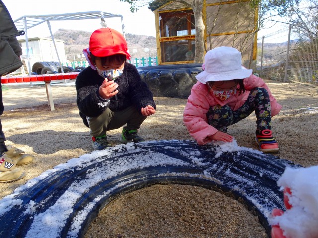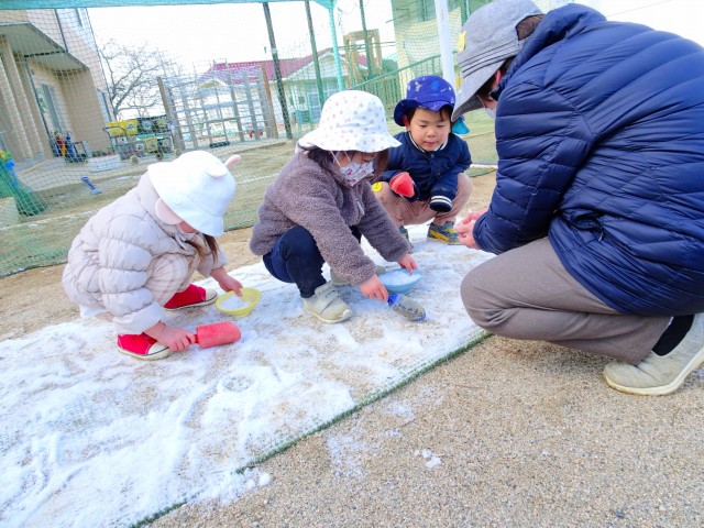 2022年02月24日 ゆきがつもったね 2歳児 にじ 前の日に雪が降り、園庭に出ると雪が積もっていました。 積もった雪を触ってみたり、集めたりしていたこどもたちでした。 「つめたい」と言いながらも楽しんでいました。 一覧へ戻る