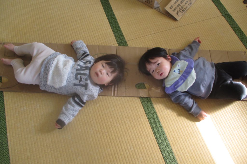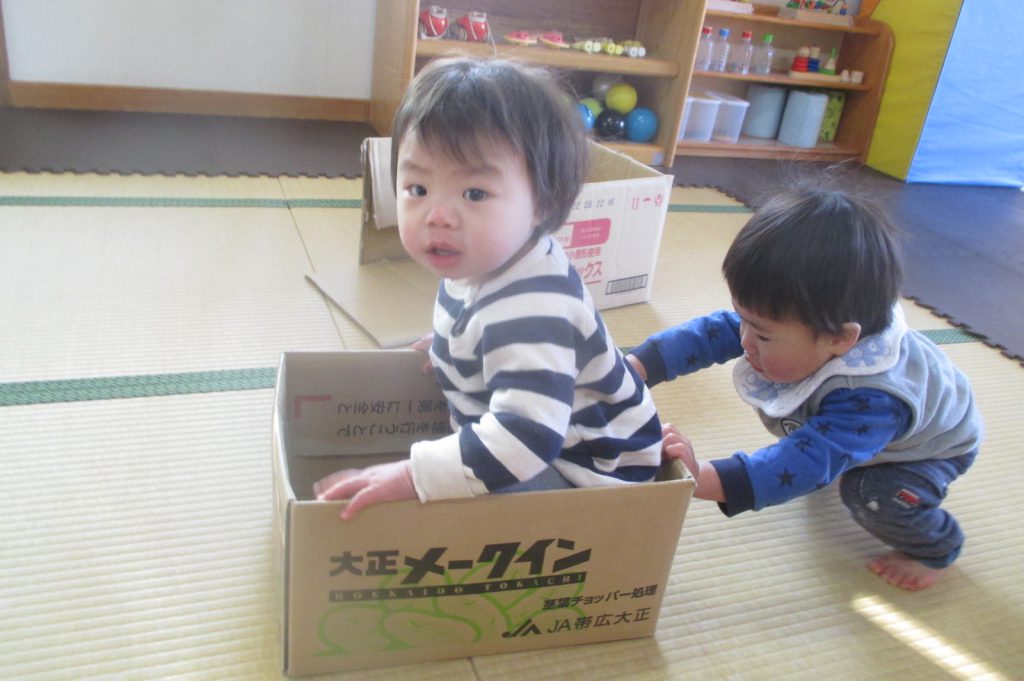 2022年03月07日 どこに行こうかな? 0歳児 はな ダンボールで遊びました。長い段ボールがあったので保育者が「ごろーん」と言って寝転ぶとこどもたちも真似をして“ごろーん”と転んでいます。その様子をみた子も一緒に転ぼうと近くに来ていました。 友だちが段ボールに入っているのを見ると“よいしょよいしょ”と押そうとしています。乗っている子も動くことが嬉しくじーっと座って楽しんでいます。押してどこに行こうかな?保育室の探索を楽しみました。 一覧へ戻る