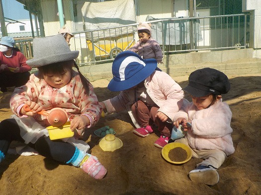 砂場に行くと、みんな夢中でごちそう作りをしています。
