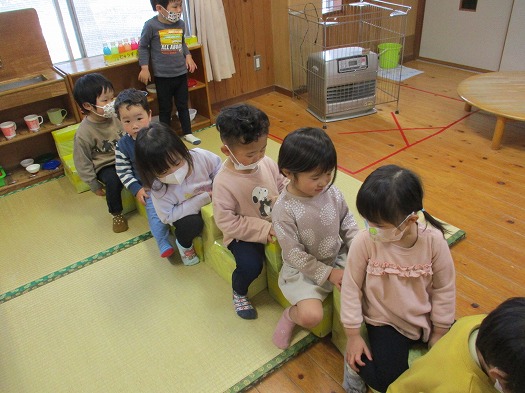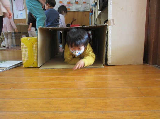 2022年03月16日 室内で・・・ 2歳児 にじ 部屋で段ボール箱や椅子を並べてあそびました。 段ボールではトンネルにしてくぐったり、家を作っていました。 椅子は並べてバスに見立てて遊んでいました。 いろんなあそびをして楽しんでいました。 一覧へ戻る