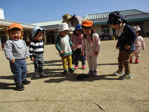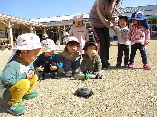 2022年03月22日 おはよう 1歳児 ゆき 昨日、目覚めたカメと対面しました。 「おはよー」と大きな声で声をかけていました。 その後、歩いている様子を観察したり、 甲羅を、よしよしとなでて触れたりする姿も見られました。 一覧へ戻る