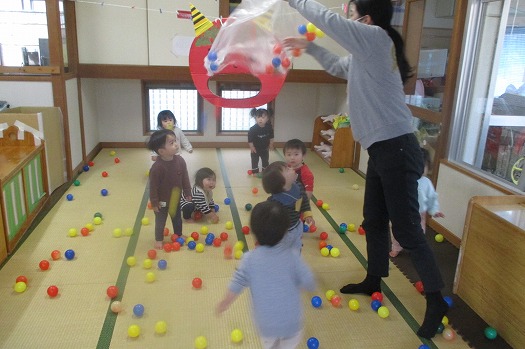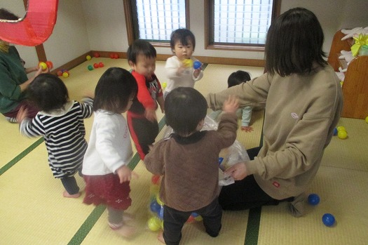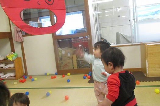 2022年03月22日 お片付けもするよ 0歳児 はな ボールをたくさん出して投げたり転がしたりして遊びました。 ボールを降らせると大喜び! 段ボール鬼の口の中に入れようと一生懸命投げていました。 「お片付けするよー」と声をかけると見つけたボールを袋の中に入れようとします。 お片付けも張り切っています。 一覧へ戻る