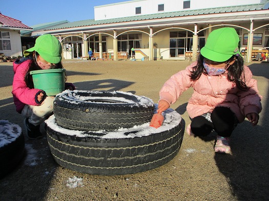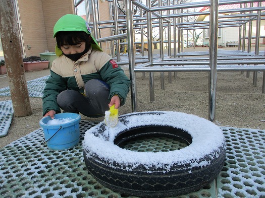 2022年02月21日 雪やこんこ~♪ 4歳児 ほし 朝、園庭に出ると雪が積もっていました。 すぐに砂場のバケツとスコップを持ってきて 雪集めに夢中のこどもたち。 「つめた~い」と言いながら雪だるまを作って楽しみました。 一覧へ戻る