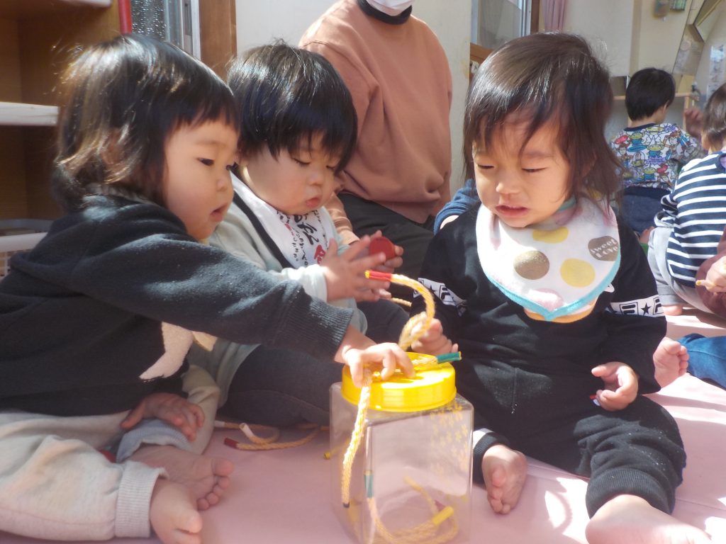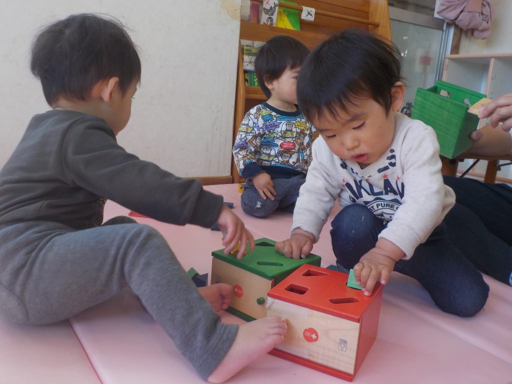 保育室でゆき組の玩具で遊びました。初めての紐や積み木のポットン落としに興味津々で、指先や手を使って上手に落としています。
